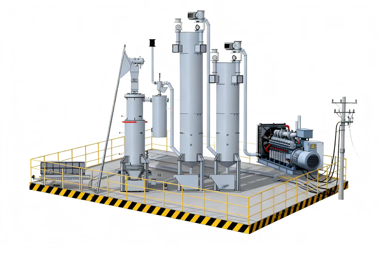 The biomass gasification power generation system generates high-temperature and high-pressure gas by passing the gas generated by biomass gasification into an internal combustion engine, driving the piston to move and convert it into mechanical energy, which is then converted into electrical energy through a generator. The core is "chemical energy → thermal energy → mechanical energy → electrical energy"